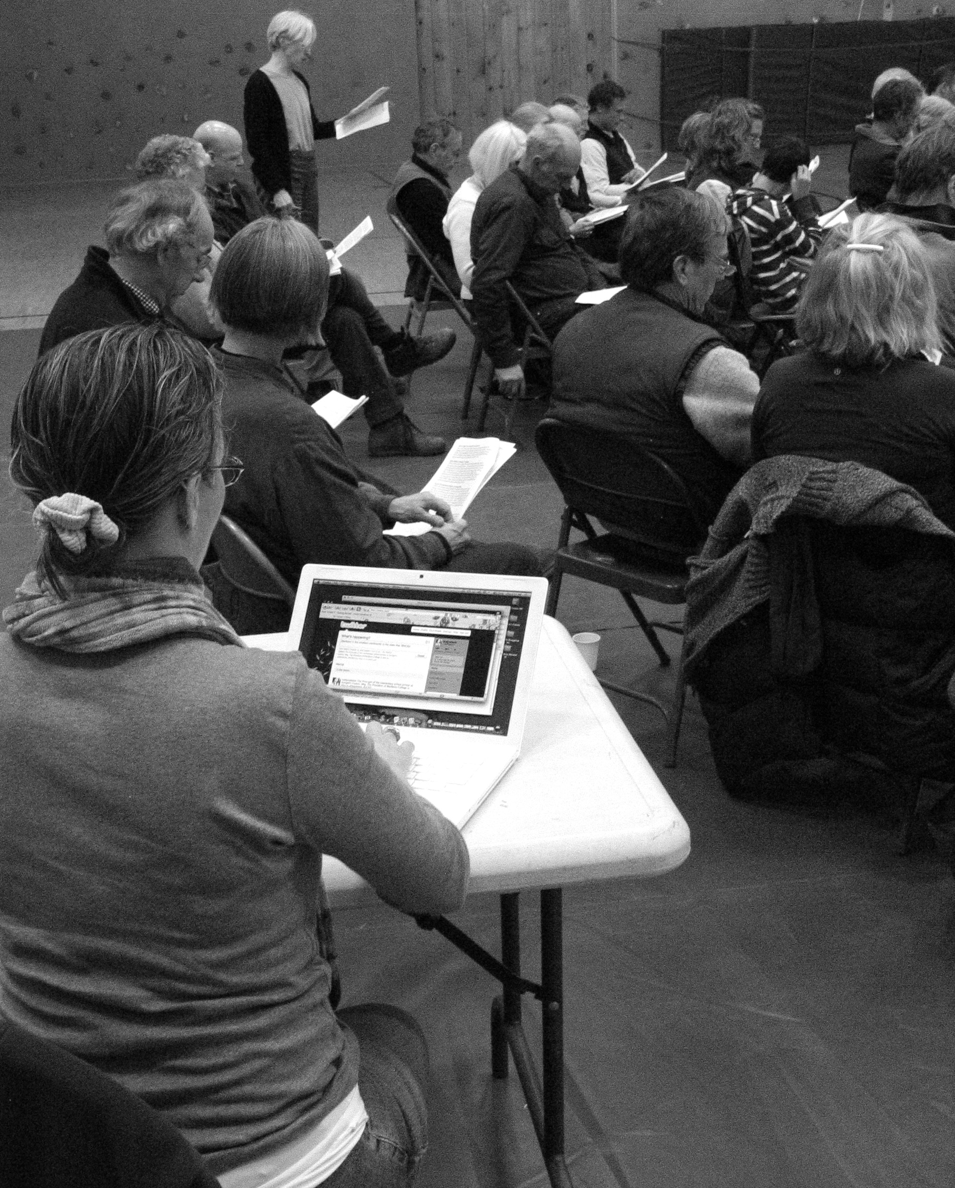 Townspeople taking turns reading summaries of “opportunities” identified at last month’s Comm Mtg.in Marlboro; voting will occur